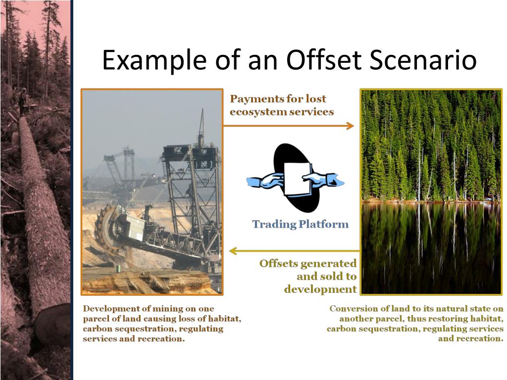 Market Based Instruments • One of the economic recommendations of the Millennium Ecosystem Assessment, as a way to better manage our resources and ecosystem services. • Can generate efficiency, innovation and competitiveness in resource development • Transfer of Development Credits (TDCs): Used to concentrate development in certain areas and relinquish development pressure in other areas • Conservation offsets: Used to counterbalance the effects of development on public and private land