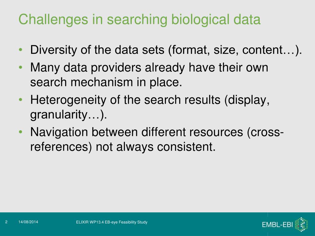 Challenges in searching biological data • Diversity of the data sets (format, size, content…). • Many data providers already have their own search mechanism in place. • Heterogeneity of the search results (display, granularity…). • Navigation between different resources (cross-references) not always consistent. ELIXIR WP13.4 EB-eye Feasibility Study