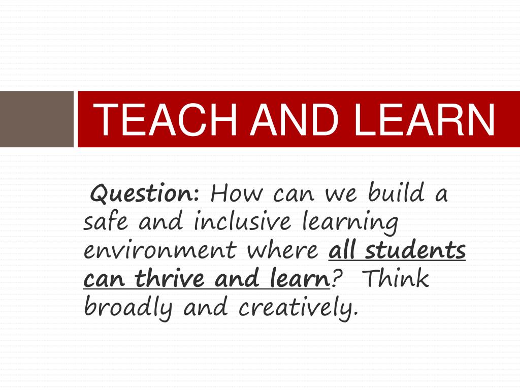 TEACH AND LEARN Question: How can we build a safe and inclusive learning environment where all students can thrive and learn? Think broadly and creatively.