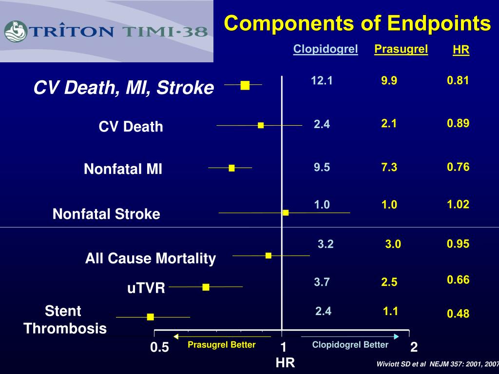 Components of Endpoints • Clopidogrel • Prasugrel • HR • 0.81 • 12.1 • 9.9 • CV Death, MI, Stroke • 0.89 • 2.1 • 2.4 • CV Death • 0.76 • 9.5 • 7.3 • Nonfatal MI • 1.02 • 1.0 • 1.0 • Nonfatal Stroke • 0.95 • 3.2 • 3.0 • All Cause Mortality • 0.66 • 3.7 • 2.5 • uTVR • Stent Thrombosis • 2.4 • 1.1 • 0.48 • 0.5 • 1 • 2 • Prasugrel Better • Clopidogrel Better • HR • Wiviott SD et al NEJM 357: 2001, 2007