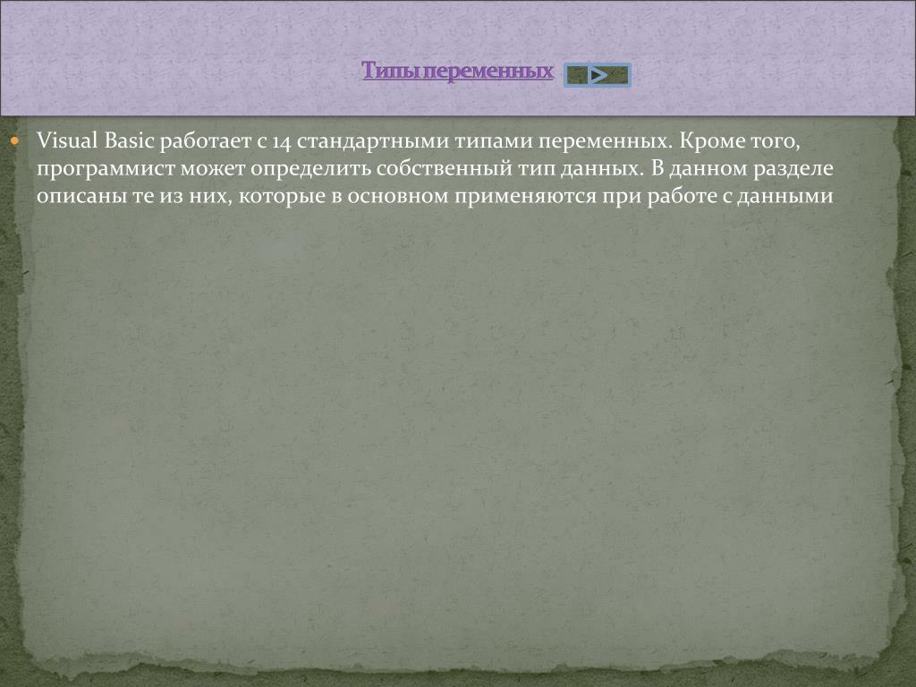 Типы переменных • Visual Basic работает с 14 стандартными типами переменных. Кроме того, программист может определить собственный тип данных. В данном разделе описаны те из них, которые в основном применяются при работе с данными