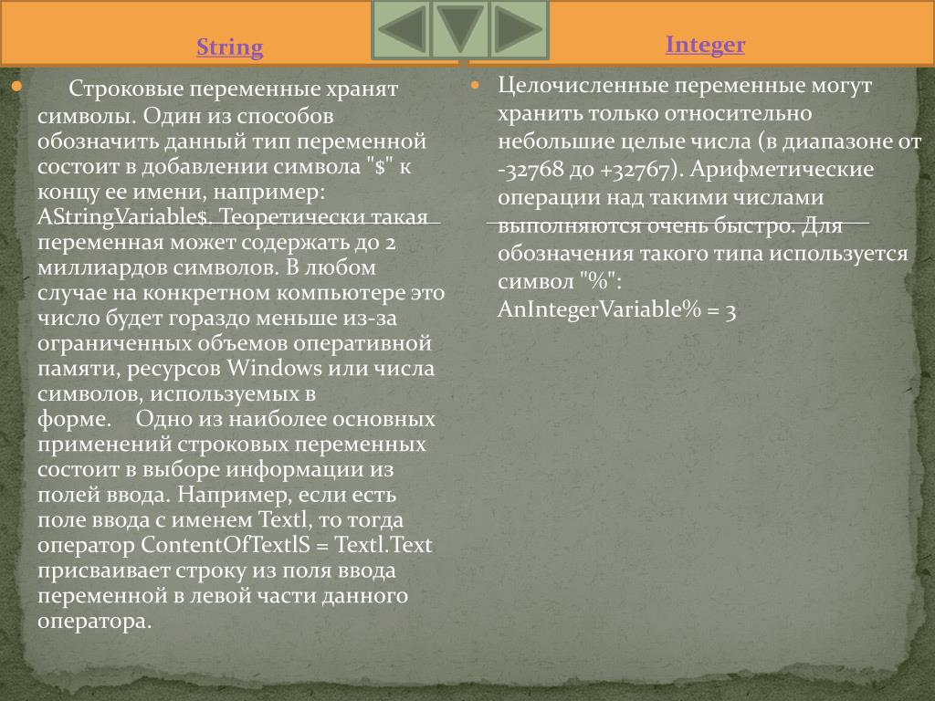 String Integer • Строковые переменные хранят символы. Один из способов обозначить данный тип переменной состоит в добавлении символа "$" к концу ее имени, например: AStringVariable$. Теоретически такая переменная может содержать до 2 миллиардов символов. В любом случае на конкретном компьютере это число будет гораздо меньше из-за ограниченных объемов оперативной памяти, ресурсов Windows или числа символов, используемых в форме. Одно из наиболее основных применений строковых переменных состоит в выборе информации из полей ввода. Например, если есть поле ввода с именем Textl, то тогда оператор ContentOfTextlS = Textl.Text присваивает строку из поля ввода переменной в левой части данного оператора. • Целочисленные переменные могут хранить только относительно небольшие целые числа (в диапазоне от -32768 до +32767). Арифметические операции над такими числами выполняются очень быстро. Для обозначения такого типа используется символ "%": AnIntegerVariable% = 3