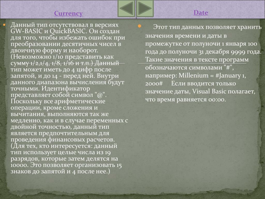 Currency Date • Данный тип отсутствовал в версиях GW-BASIC и QuickBASIC. Он создан для того, чтобы избежать ошибок при преобразовании десятичных чисел в двоичную форму и наоборот. (Невозможно 1/10 представить как сумму 1/2,1/4, 1/8, 1/16 и т.п.) Данный тип может иметь до 4 цифр после запятой, и до 14 - перед ней. Внутри данного диапазона вычисления будут точными. Идентификатор представляет собой символ "@". Поскольку все арифметические операции, кроме сложения и вычитания, выполняются так же медленно, как и в случае переменных с двойной точностью, данный тип является предпочтительным для проведения финансовых расчетов. (Для тех, кто интересуется: данный тип использует целые числа из 19 разрядов, которые затем делятся на 10000. Это позволяет организовать 15 знаков до запятой и 4 после нее.) • Этот тип данных позволяет хранить значения времени и даты в промежутке от полуночи 1 января 100 года до полуночи 31 декабря 9999 года. Такие значения в тексте программ обозначаются символами "#", например: Millenium = #January 1, 2000# Если вводится только значение даты, Visual Basic полагает, что время равняется 00:00.