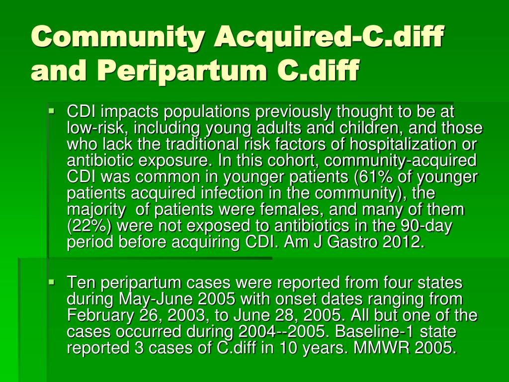 Community Acquired-C.diff and PeripartumC.diff • CDI impacts populations previously thought to be at low-risk, including young adults and children, and those who lack the traditional risk factors of hospitalization or antibiotic exposure. In this cohort, community-acquired CDI was common in younger patients (61% of younger patients acquired infection in the community), the majority of patients were females, and many of them (22%) were not exposed to antibiotics in the 90-day period before acquiring CDI. Am J Gastro 2012. • Ten peripartum cases were reported from four states during May-June 2005 with onset dates ranging from February 26, 2003, to June 28, 2005. All but one of the cases occurred during 2004--2005. Baseline-1 state reported 3 cases of C.diff in 10 years. MMWR 2005.