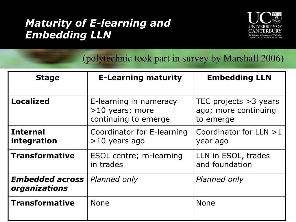 Maturity of E-learning and Embedding LLN (polytechnic took part in survey by Marshall 2006)