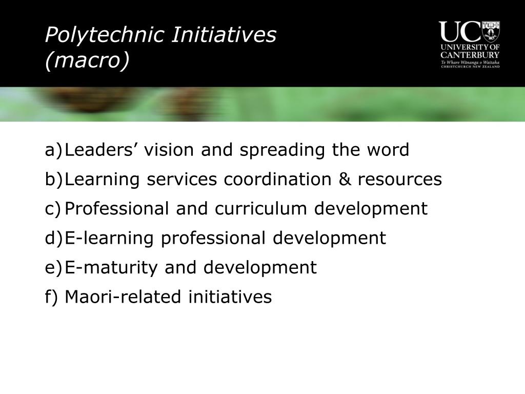Polytechnic Initiatives (macro) • Leaders’ vision and spreading the word • Learning services coordination & resources • Professional and curriculum development • E-learning professional development • E-maturity and development • Maori-related initiatives