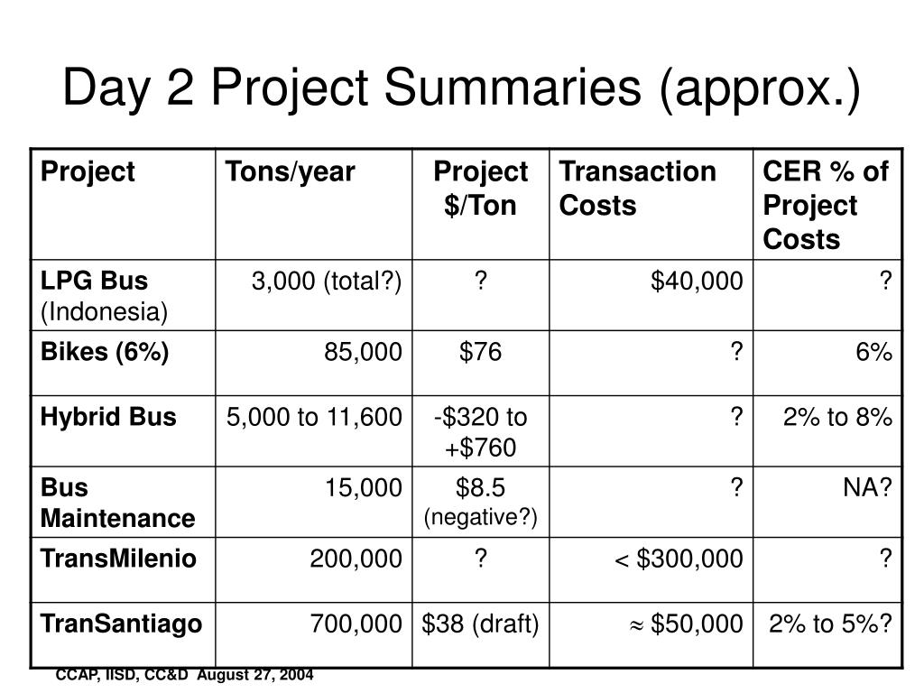 Day 2 Project Summaries (approx.) CCAP, IISD, CC&D August 27, 2004