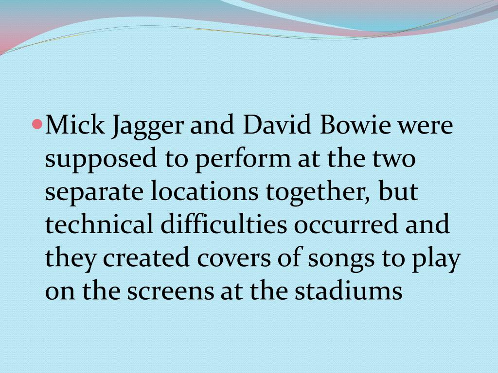 Mick Jagger and David Bowie were supposed to perform at the two separate locations together, but technical difficulties occurred and they created covers of songs to play on the screens at the stadiums