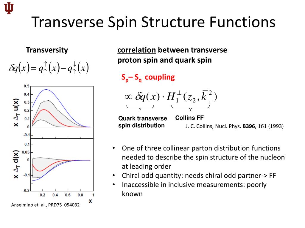 Transverse Spin Structure Functions Transversitycorrelation between transverse proton spin and quark spin Sp– Sq coupling Collins FF Quark transverse spin distribution J. C. Collins, Nucl. Phys. B396, 161 (1993) • One of three collinear parton distribution functions needed to describe the spin structure of the nucleon at leading order • Chiral odd quantity: needs chiral odd partner-> FF • Inaccessible in inclusive measurements: poorly known Anselmino et. al., PRD75 054032