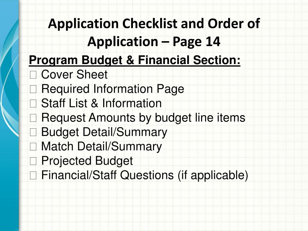 Application Checklist and Order of Application – Page 14 Program Budget & Financial Section: Cover Sheet Required Information Page Staff List & Information Request Amounts by budget line items Budget Detail/Summary Match Detail/Summary Projected Budget Financial/Staff Questions (if applicable)