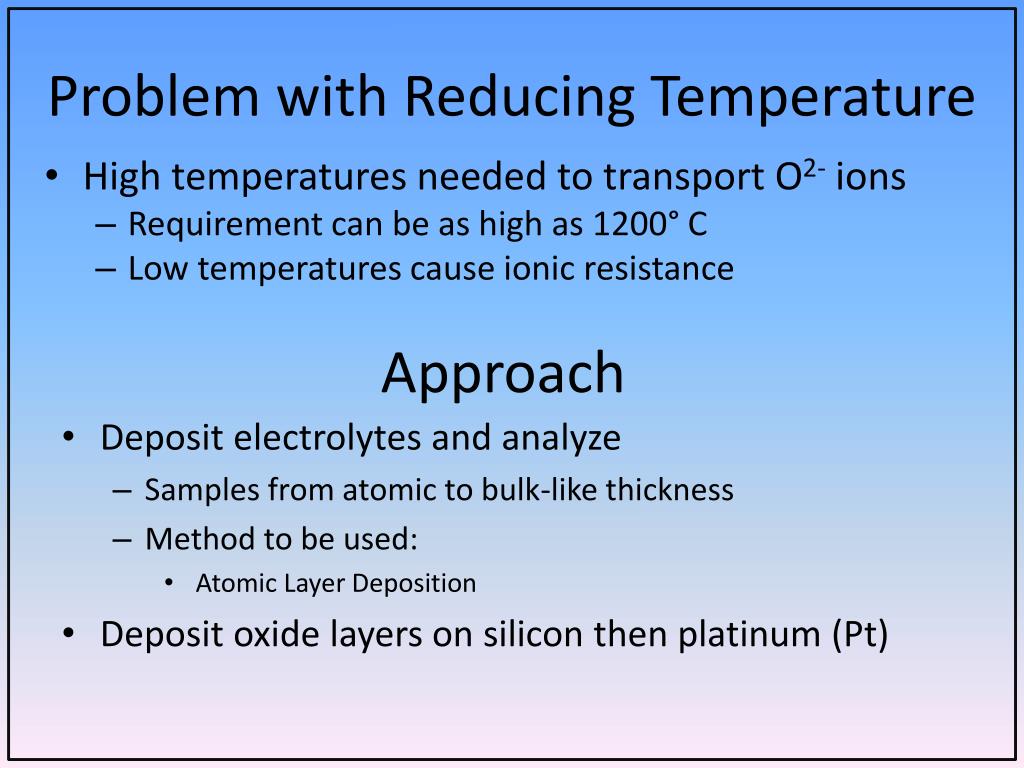 Problem with Reducing Temperature • High temperatures needed to transport O2- ions • Requirement can be as high as 1200° C • Low temperatures cause ionic resistance Approach • Deposit electrolytes and analyze • Samples from atomic to bulk-like thickness • Method to be used: • Atomic Layer Deposition • Deposit oxide layers on silicon then platinum (Pt)