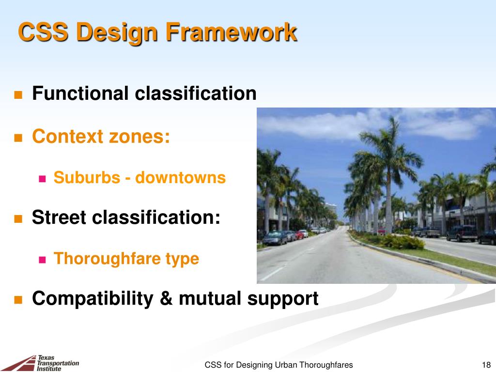 CSS Design Framework • Functional classification • Context zones: • Suburbs - downtowns • Street classification: • Thoroughfare type • Compatibility & mutual support