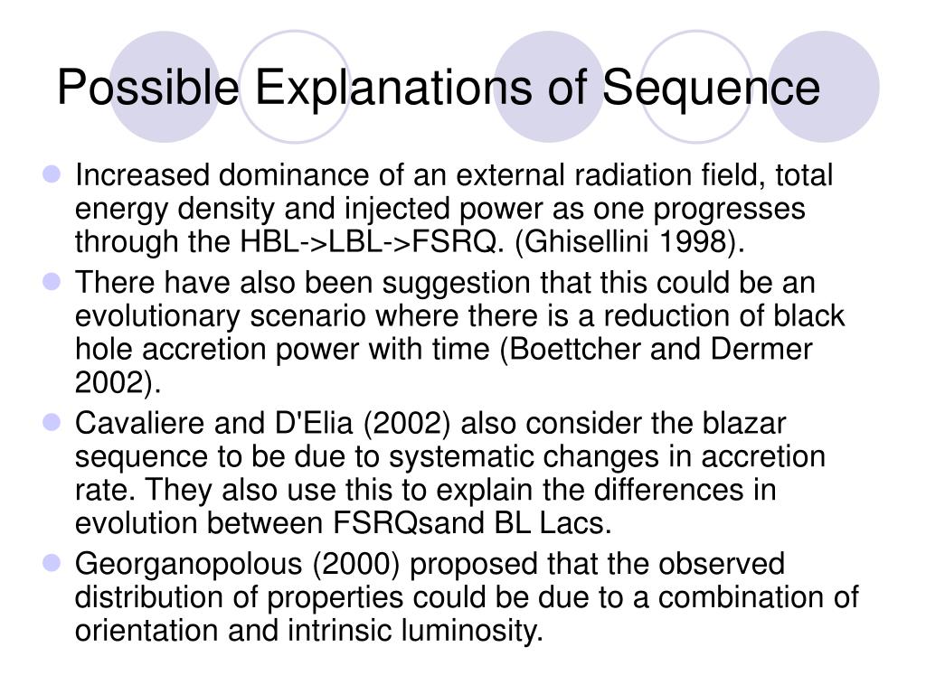 Increased dominance of an external radiation field, total energy density and injected power as one progresses through the HBL->LBL->FSRQ. (Ghisellini 1998). There have also been suggestion that this could be an evolutionary scenario where there is a reduction of black hole accretion power with time (Boettcher and Dermer 2002). Cavaliere and D'Elia (2002) also consider the blazar sequence to be due to systematic changes in accretion rate. They also use this to explain the differences in evolution between FSRQsand BL Lacs. Georganopolous (2000) proposed that the observed distribution of properties could be due to a combination of orientation and intrinsic luminosity. Possible Explanations of Sequence
