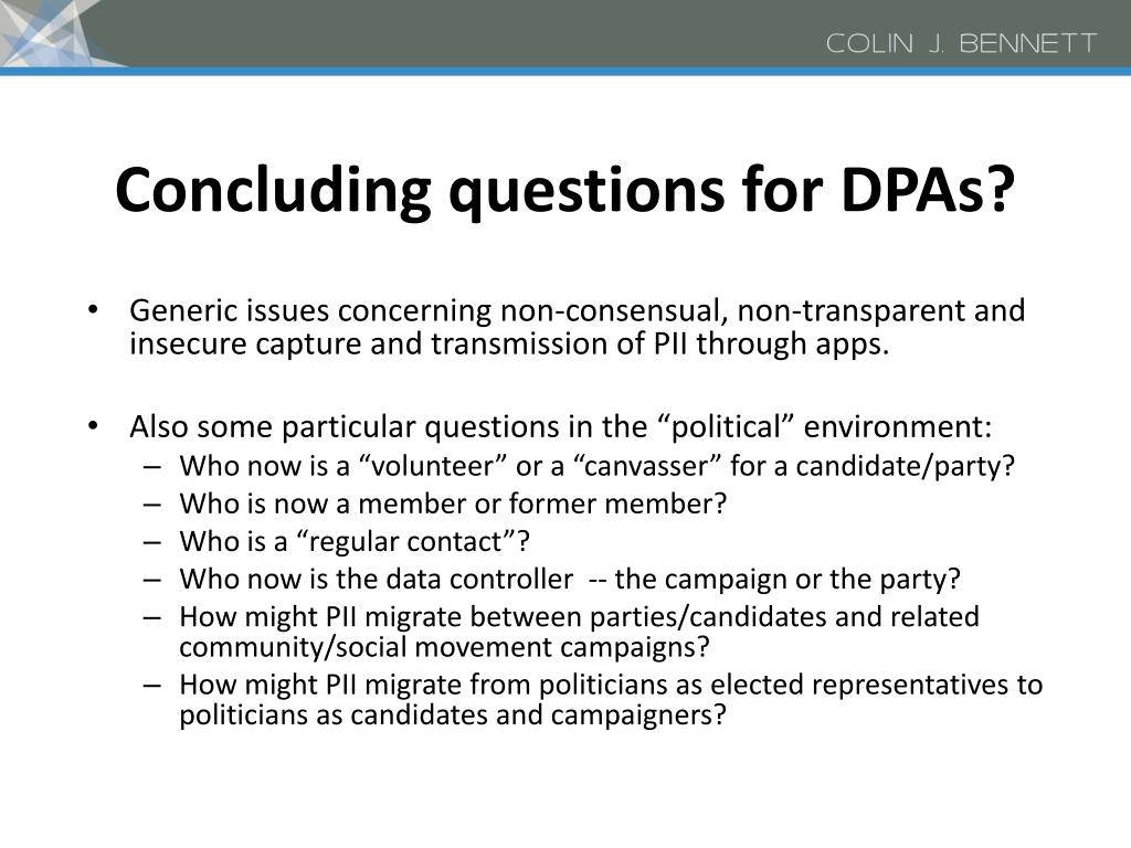 Concluding questions for DPAs? • Generic issues concerning non-consensual, non-transparent and insecure capture and transmission of PII through apps. • Also some particular questions in the “political” environment: • Who now is a “volunteer” or a “canvasser” for a candidate/party? • Who is now a member or former member? • Who is a “regular contact”? • Who now is the data controller -- the campaign or the party? • How might PII migrate between parties/candidates and related community/social movement campaigns? • How might PII migrate from politicians as elected representatives to politicians as candidates and campaigners?