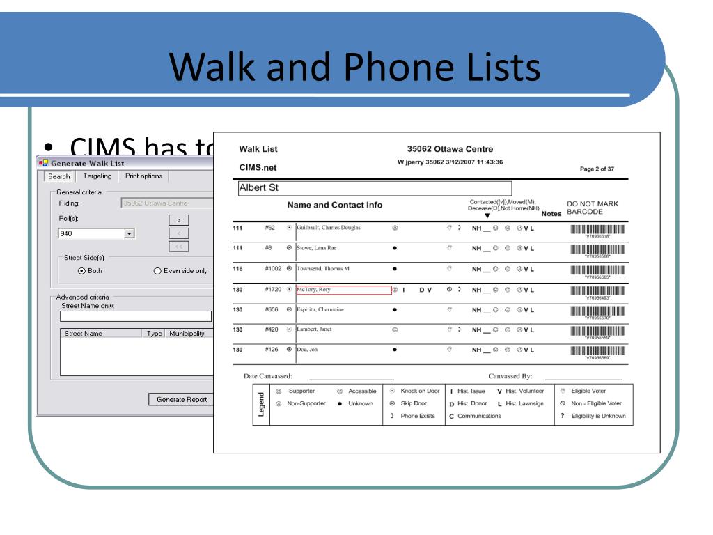Walk and Phone Lists • CIMS has tools to print off lists for canvassers • Each sheet contains the name, address and support level of each constituent • Sheet has a location for entering information gained from the house • Information is then scanned back into CIMS