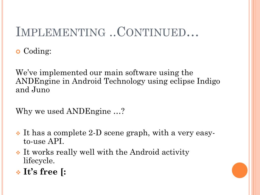 Implementing ..Continued… • Coding: We’ve implemented our main software using the ANDEngine in Android Technology using eclipse Indigo and Juno Why we used ANDEngine …? • It has a complete 2-D scene graph, with a very easy-to-use API. • It works really well with the Android activity lifecycle. • It’s free [: