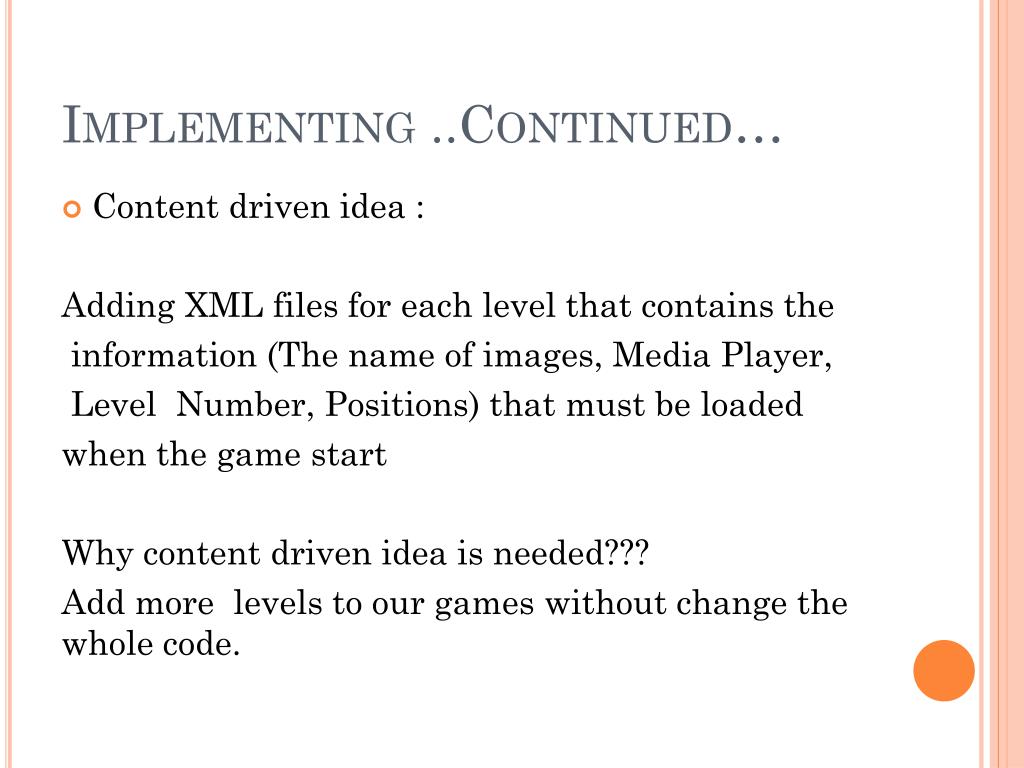 Implementing ..Continued… • Content driven idea : Adding XML files for each level that contains the information (The name of images, Media Player, Level Number, Positions) that must be loaded when the game start Why content driven idea is needed??? Add more levels to our games without change the whole code.