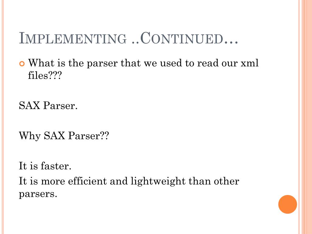 Implementing ..Continued… • What is the parser that we used to read our xml files??? SAX Parser. Why SAX Parser?? It is faster. It is more efficient and lightweight than other parsers.