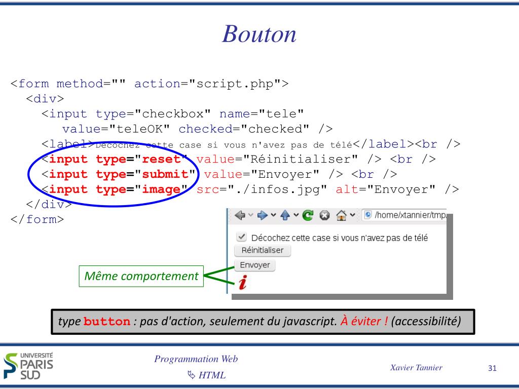Bouton Même comportement <form method="" action="script.php"> <div> <input type="checkbox" name="tele" value="teleOK" checked="checked" /> <label>Décochez cette case si vous n'avez pas de télé</label><br /> <input type="reset" value="Réinitialiser" /> <br /> <input type="submit" value="Envoyer" /> <br /> <input type="image" src="./infos.jpg" alt="Envoyer" /> </div> </form> typebutton: pas d'action, seulement du javascript. À éviter ! (accessibilité)