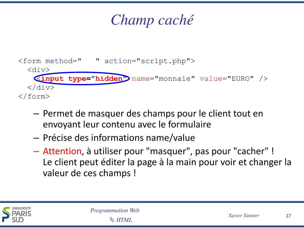 Champ caché <form method=" " action="script.php"> <div> <input type="hidden" name="monnaie" value="EURO"/> </div> </form> • Permet de masquer des champs pour le client tout en envoyant leur contenu avec le formulaire • Précise des informations name/value • Attention, à utiliser pour "masquer", pas pour "cacher" ! Le client peut éditer la page à la main pour voir et changer la valeur de ces champs !