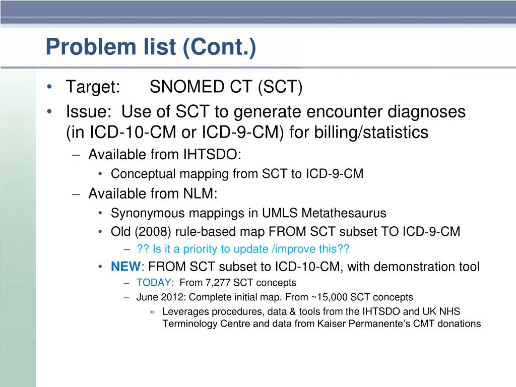 Problem list (Cont.) • Target: SNOMED CT (SCT) • Issue: Use of SCT to generate encounter diagnoses (in ICD-10-CM or ICD-9-CM) for billing/statistics • Available from IHTSDO: • Conceptual mapping from SCT to ICD-9-CM • Available from NLM: • Synonymous mappings in UMLS Metathesaurus • Old (2008) rule-based map FROM SCT subset TO ICD-9-CM • ?? Is it a priority to update /improve this?? • NEW: FROM SCT subset to ICD-10-CM, with demonstration tool • TODAY: From 7,277 SCT concepts • June 2012: Complete initial map. From ~15,000 SCT concepts • Leverages procedures, data & tools from the IHTSDO and UK NHS Terminology Centre and data from Kaiser Permanente’s CMT donations