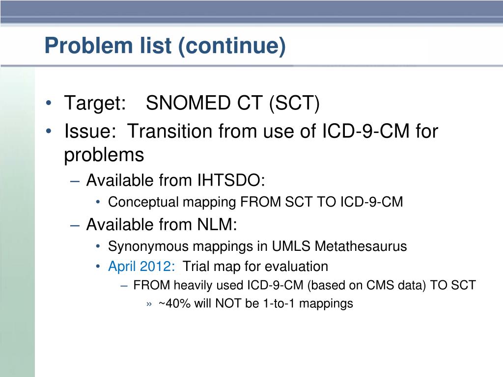 Problem list (continue) • Target: SNOMED CT (SCT) • Issue: Transition from use of ICD-9-CM for problems • Available from IHTSDO: • Conceptual mapping FROM SCT TO ICD-9-CM • Available from NLM: • Synonymous mappings in UMLS Metathesaurus • April 2012: Trial map for evaluation • FROM heavily used ICD-9-CM (based on CMS data) TO SCT • ~40% will NOT be 1-to-1 mappings