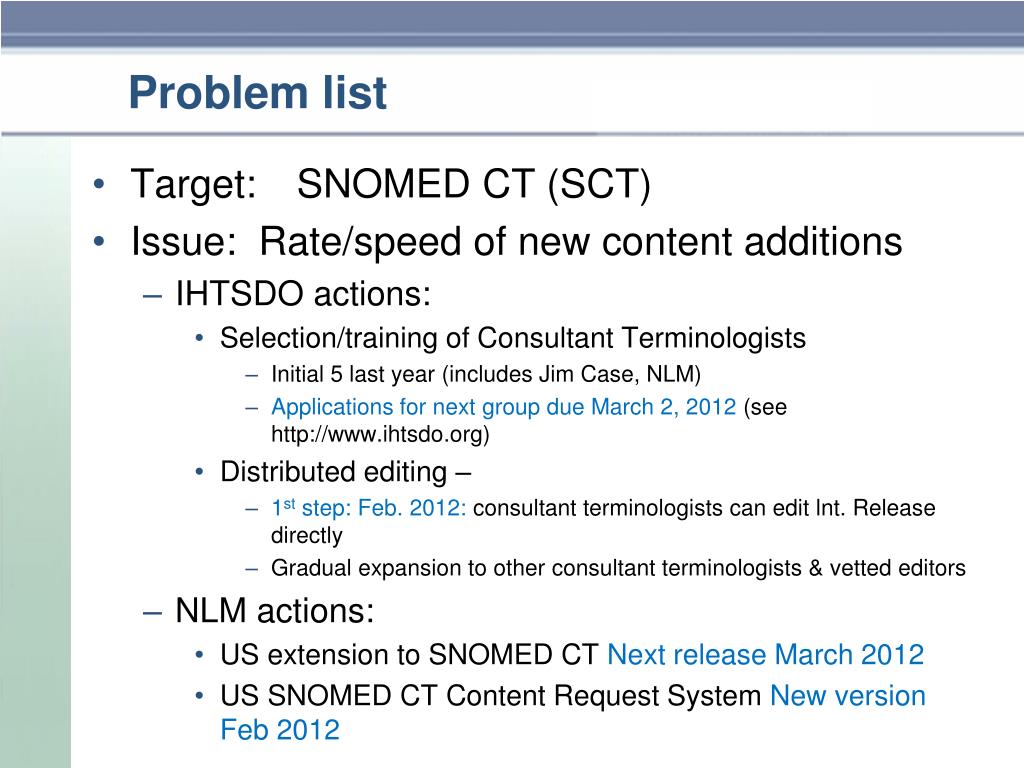 Problem list • Target: SNOMED CT (SCT) • Issue: Rate/speed of new content additions • IHTSDO actions: • Selection/training of Consultant Terminologists • Initial 5 last year (includes Jim Case, NLM) • Applications for next group due March 2, 2012 (see http://www.ihtsdo.org) • Distributed editing – • 1st step: Feb. 2012: consultant terminologists can edit lnt. Release directly • Gradual expansion to other consultant terminologists & vetted editors • NLM actions: • US extension to SNOMED CT Next release March 2012 • US SNOMED CT Content Request System New version Feb 2012