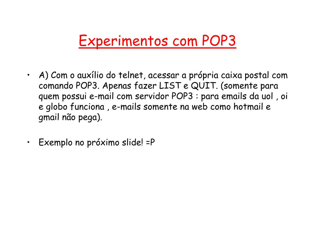 Experimentos com POP3 • A) Com o auxílio do telnet, acessar a própria caixa postal com comando POP3. Apenas fazer LIST e QUIT. (somente para quem possui e-mail com servidor POP3 : para emails da uol , oi e globo funciona , e-mails somente na web como hotmail e gmail não pega). • Exemplo no próximo slide! =P