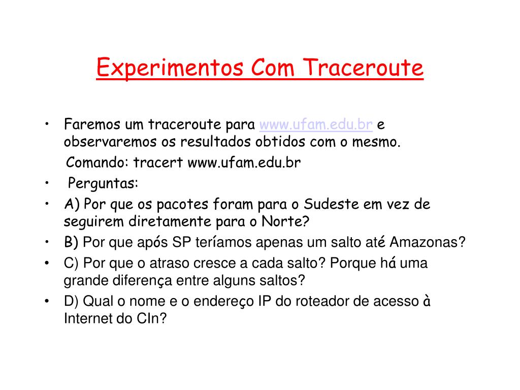 Experimentos Com Traceroute • Faremos um traceroute para www.ufam.edu.br e observaremos os resultados obtidos com o mesmo. Comando: tracert www.ufam.edu.br • Perguntas: • A) Por que os pacotes foram para o Sudeste em vez de seguirem diretamente para o Norte? • B) Por que apósSP teríamos apenas um salto até Amazonas? • C) Por que o atraso cresce a cada salto? Porque há uma grande diferença entre alguns saltos? • D) Qual o nome e o endereço IP do roteador de acesso à Internet do CIn?