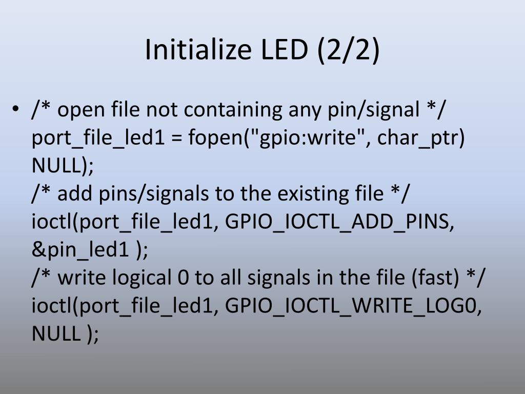 Initialize LED (2/2) • /* open file not containing any pin/signal */ port_file_led1 = fopen("gpio:write", char_ptr) NULL);/* add pins/signals to the existing file */ioctl(port_file_led1, GPIO_IOCTL_ADD_PINS, &pin_led1 );/* write logical 0 to all signals in the file (fast) */ioctl(port_file_led1, GPIO_IOCTL_WRITE_LOG0, NULL );