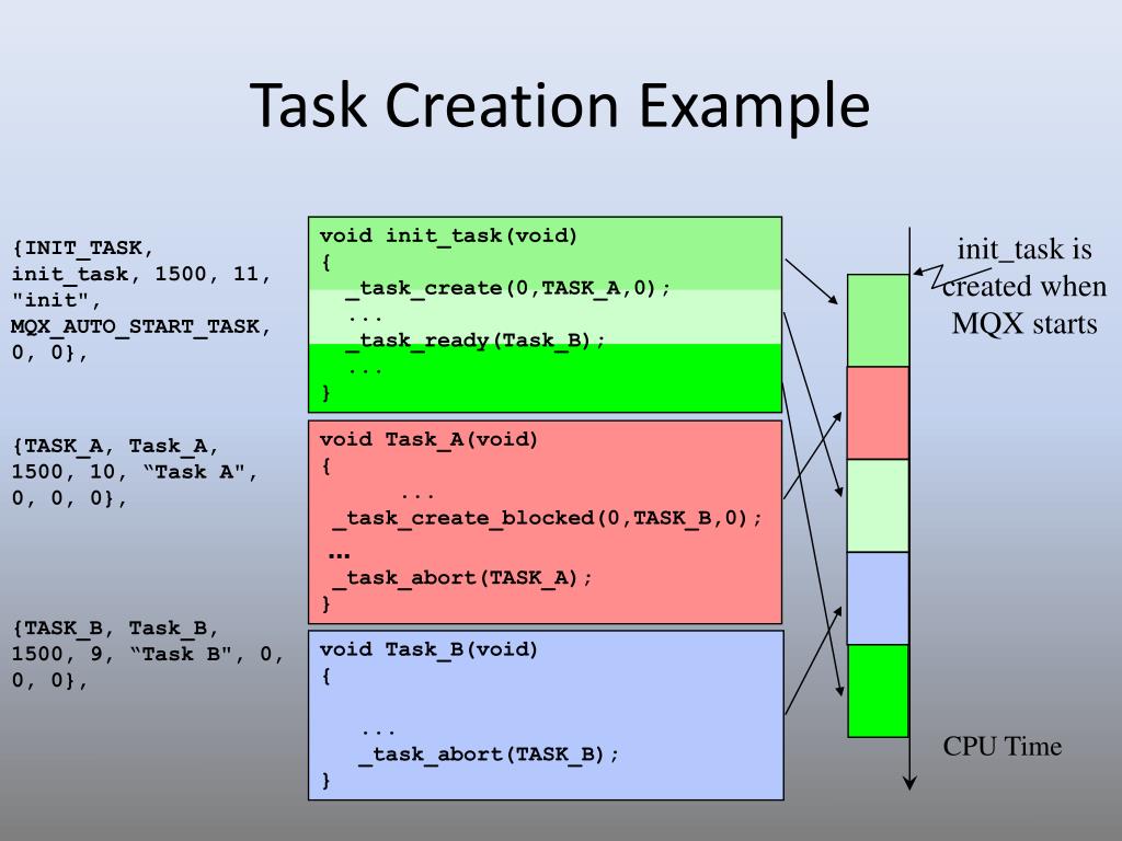 Task Creation Example void init_task(void) { _task_create(0,TASK_A,0); ... _task_ready(Task_B); ... } init_task is created when MQX starts {INIT_TASK, init_task, 1500, 11, "init", MQX_AUTO_START_TASK, 0, 0}, void Task_A(void) { ... _task_create_blocked(0,TASK_B,0); ... _task_abort(TASK_A); } {TASK_A, Task_A, 1500, 10, “Task A", 0, 0, 0}, {TASK_B, Task_B, 1500, 9, “Task B", 0, 0, 0}, void Task_B(void) { ... _task_abort(TASK_B); } CPU Time