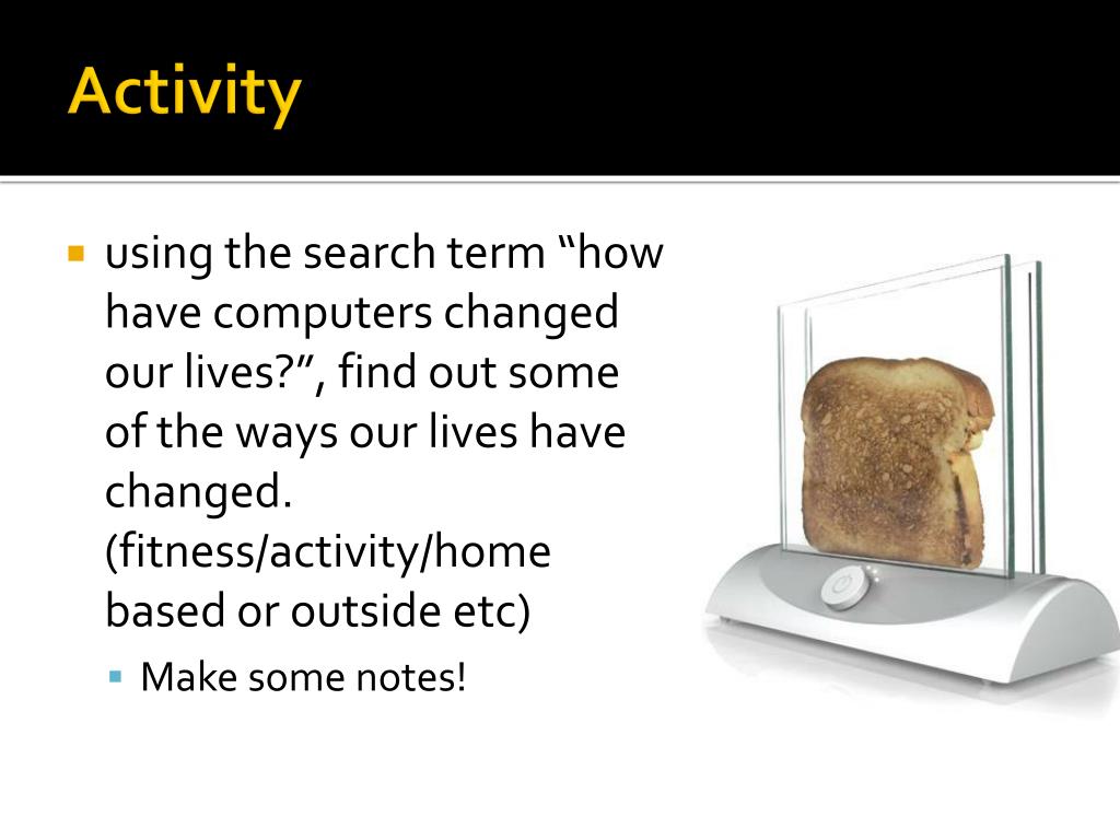 Activity • using the search term “how have computers changed our lives?”, find out some of the ways our lives have changed. (fitness/activity/home based or outside etc) • Make some notes!