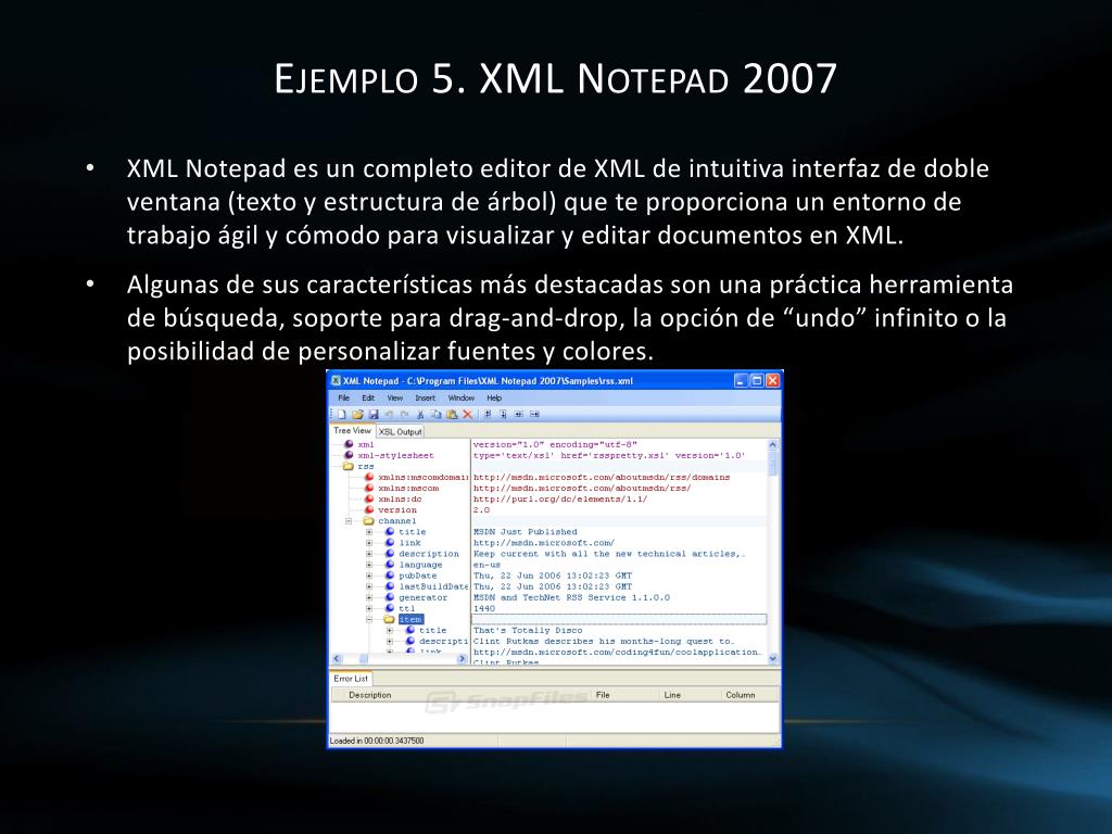 Ejemplo 5. XML Notepad 2007 • XML Notepad es un completo editor de XML de intuitiva interfaz de doble ventana (texto y estructura de árbol) que te proporciona un entorno de trabajo ágil y cómodo para visualizar y editar documentos en XML. • Algunas de sus características más destacadas son una práctica herramienta de búsqueda, soporte para drag-and-drop, la opción de “undo” infinito o la posibilidad de personalizar fuentes y colores.