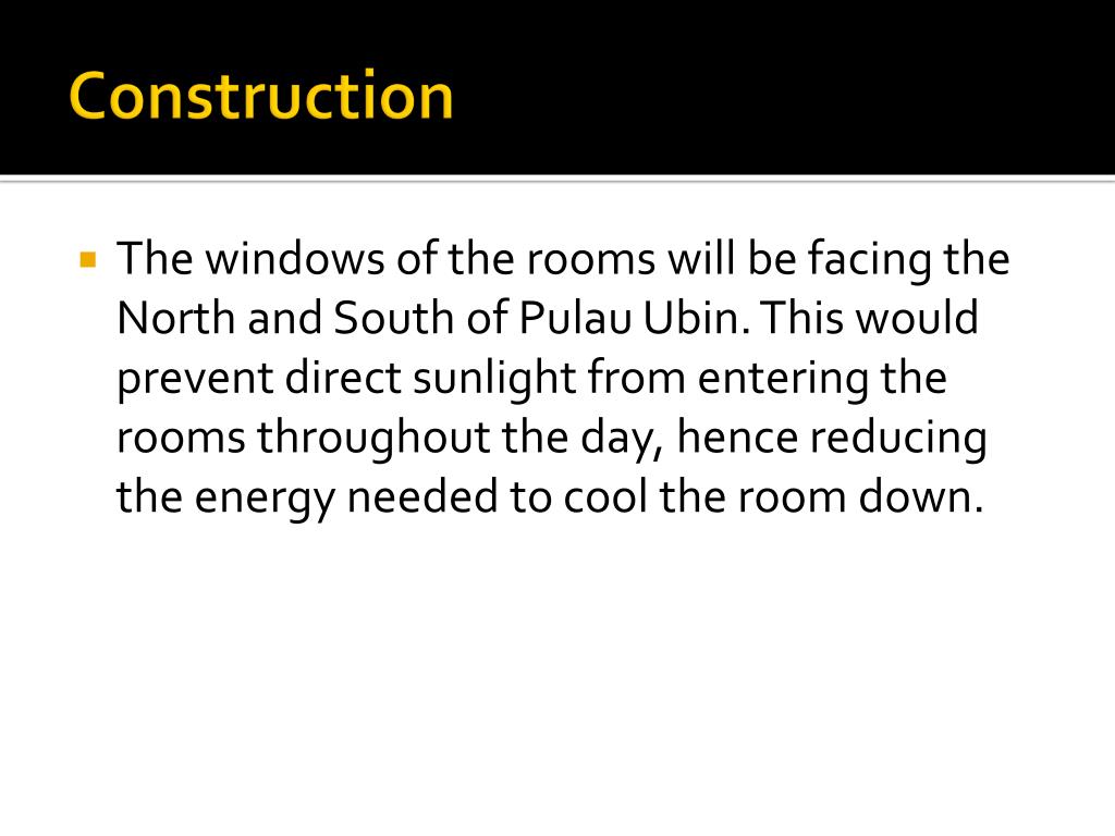 Construction • The windows of the rooms will be facing the North and South of Pulau Ubin. This would prevent direct sunlight from entering the rooms throughout the day, hence reducing the energy needed to cool the room down.