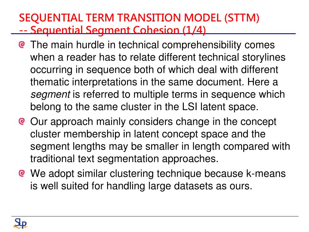 SEQUENTIAL TERM TRANSITION MODEL (STTM)-- Sequential Segment Cohesion (1/4) • The main hurdle in technical comprehensibility comes when a reader has to relate different technical storylines occurring in sequence both of which deal with different thematic interpretations in the same document. Here a segment is referred to multiple terms in sequence which belong to the same cluster in the LSI latent space. • Our approach mainly considers change in the concept cluster membership in latent concept space and the segment lengths may be smaller in length compared with traditional text segmentation approaches. • We adopt similar clustering technique because k-means is well suited for handling large datasets as ours.