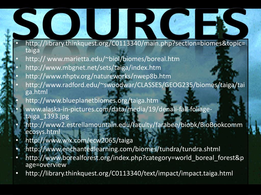Sources • http://library.thinkquest.org/C0113340/main.php?section=biomes&topic=taiga • http:// www.marietta.edu/~biol/biomes/boreal.htm • http://www.mbgnet.net/sets/taiga/index.htm • http://www.nhptv.org/natureworks/nwep8b.htm • http://www.radford.edu/~swoodwar/CLASSES/GEOG235/biomes/taiga/taiga.html • http://www.blueplanetbiomes.org/taiga.htm • www.alaska-in-pictures.com/data/media/19/denali-fall-foliage-taiga_1393.jpg • http://www2.estrellamountain.edu/faculty/farabee/biobk/BioBookcommecosys.html • http://www.wix.com/ecw2065/taiga • http://www.enchantedlearning.com/biomes/tundra/tundra.shtml • http://www.borealforest.org/index.php?category=world_boreal_forest&page=overview • http://library.thinkquest.org/C0113340/text/impact/impact.taiga.html