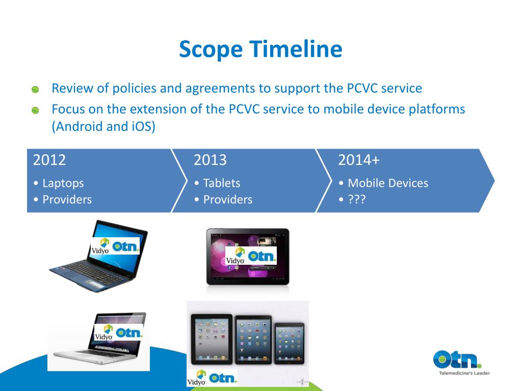 Scope Timeline • Review of policies and agreements to support the PCVC service • Focus on the extension of the PCVC service to mobile device platforms (Android and iOS) • 2012 • Laptops • Providers • 2013 • Tablets • Providers • 2014+ • Mobile Devices • ???