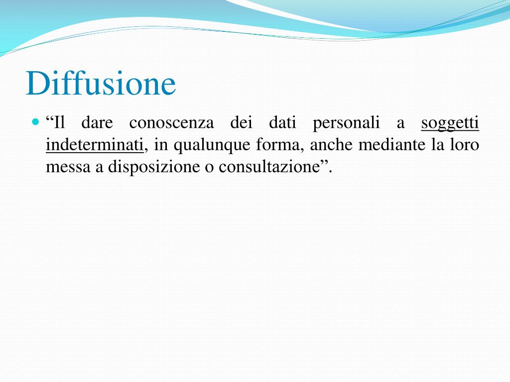 Diffusione • “Il dare conoscenza dei dati personali a soggetti indeterminati, in qualunque forma, anche mediante la loro messa a disposizione o consultazione”.