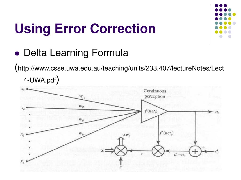 Using Error Correction • Delta Learning Formula (http://www.csse.uwa.edu.au/teaching/units/233.407/lectureNotes/Lect4-UWA.pdf)
