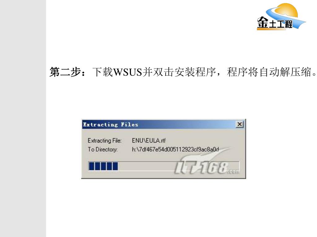 内蒙古金土工程补丁服务器培训. 金土工程实施办公室. 目录 补丁服务器安装 补丁服务器客户端安装 内网补丁服务器升级方法. WSUS 补丁服务器. 通过 WSUS 我们可以建立一个内部的 UPDATE 服务器,让内网的计算机直接到这台 UPDATE 服务器上下载补丁,使得更新补丁时间大大缩短,提高了安全性。 对于没有连到 INTERNET 的计算机只要在内网中可以访问这台 UPDATE 服务器也可以随时安装最新的补丁,有效的防止了漏洞型病毒在内网的传播。. WSUS ( Windows Server Update Services )新特性: