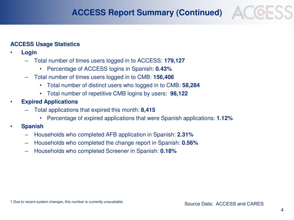 ACCESS Report Summary (Continued) • Report My Changes3(RMC) • Reports • Started this month: 8,917 • Submitted this month: 6,265 • Renew My Benefits • Renewals • FoodShare: 7,284 • Health Care: 887 • Family Planning Waiver: 1,243 • Child Care: 893 • Six Month Report Forms (SMRFs) • Submissions • FoodShare Only: 1,789 • Child Care Only: 365 • Both FoodShare and Child Care: 2,154 Apply For Benefits1 (AFB) • Applications • Started to date: 1,362,994 • Average started per month: 33,4302 • Submitted to date: 905,145 • Average completed per month: 23,4682 • Full applications: 840,104 • Applications with just filing date: 38,041 • Priority Service Eligible: 29% • Applications by Program • FoodShare: 665,196 • Priority Service Eligible: 253,473 • Not Priority Service Eligible: 411,723 • Health Care: 447,511 • Family Planning Waiver: 208,945 • Child Care: 1,816 1 Cumulative totals from June 2006 to present. 2 Average over the last 3 months. 3 Cumulative totals from September 2006 to present Source Data: ACCESS and CARES