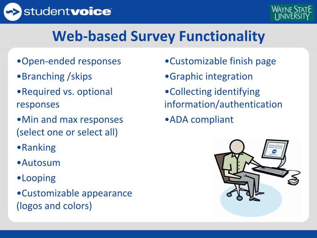 Web-based Survey Functionality • Open-ended responses • Branching /skips • Required vs. optional responses • Min and max responses (select one or select all) • Ranking • Autosum • Looping • Customizable appearance (logos and colors) • Customizable finish page • Graphic integration • Collecting identifying information/authentication • ADA compliant