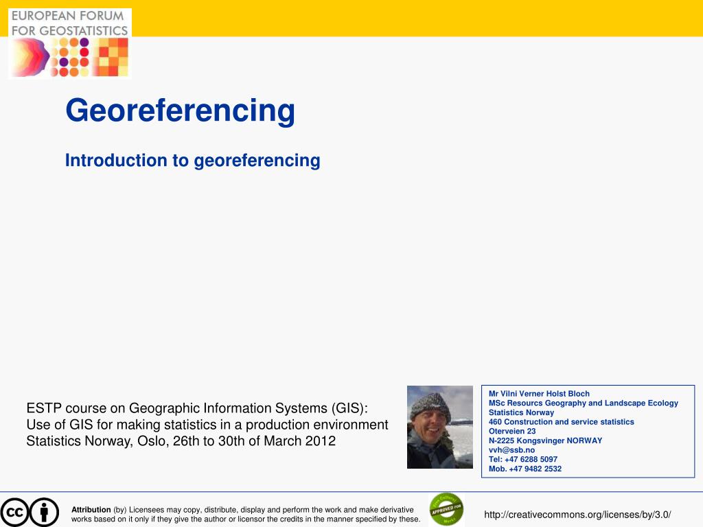 GeoreferencingIntroduction to georeferencing Mr Vilni Verner Holst Bloch MSc Resourcs Geography and Landscape Ecology Statistics Norway 460 Construction and service statistics Oterveien 23 N-2225 Kongsvinger NORWAY vvh@ssb.no Tel: +47 6288 5097 Mob. +47 9482 2532 ESTP course on Geographic Information Systems (GIS): Use of GIS for making statistics in a production environment Statistics Norway, Oslo, 26th to 30th of March 2012 Attribution (by) Licensees may copy, distribute, display and perform the work and make derivative works based on it only if they give the author or licensor the credits in the manner specified by these. http://creativecommons.org/licenses/by/3.0/