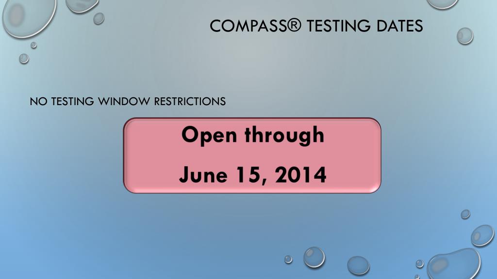 COMPASS® Testing Dates Open through June 15, 2014 No testing window restrictions