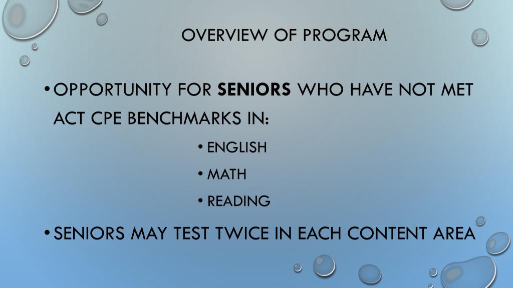 Overview of Program • Opportunity for SENIORS who have not met ACT CPE benchmarks in: • English • Math • Reading • Seniors may test TWICE in each content area