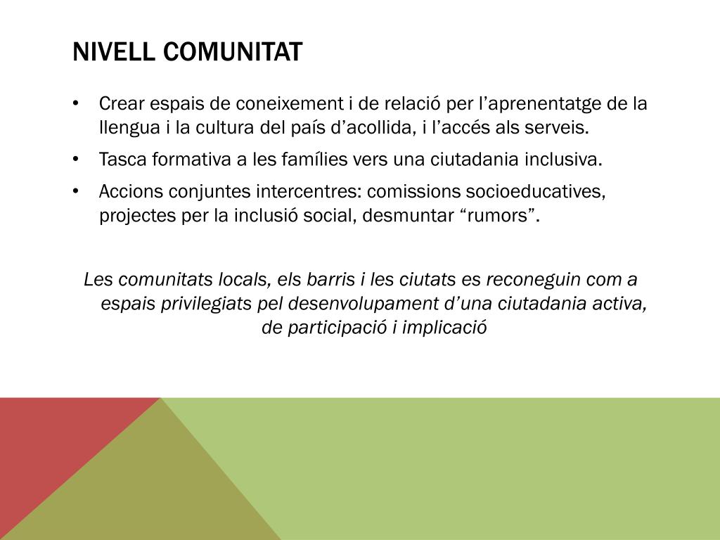 Nivellcomunitat • Crear espais de coneixement i de relacióper l’aprenentatge de la llengua i la cultura del país d’acollida, i l’accés als serveis. • Tasca formativa a les famílies vers una ciutadania inclusiva. • Accions conjuntes intercentres: comissions socioeducatives, projectes per la inclusió social, desmuntar “rumors”. • Les comunitats locals, els barris i les ciutats es reconeguin com a espais privilegiats pel desenvolupament d’una ciutadania activa, de participació i implicació