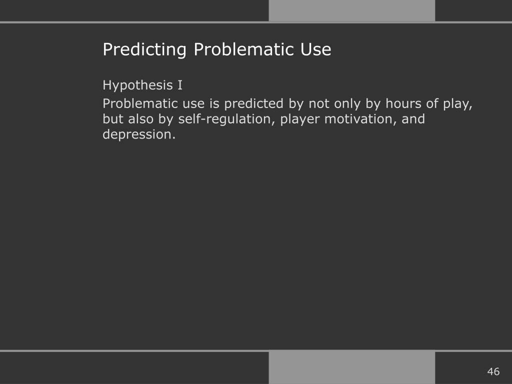 Predicting Problematic Use • Hypothesis I • Problematic use is predicted by not only by hours of play, but also by self-regulation, player motivation, and depression.