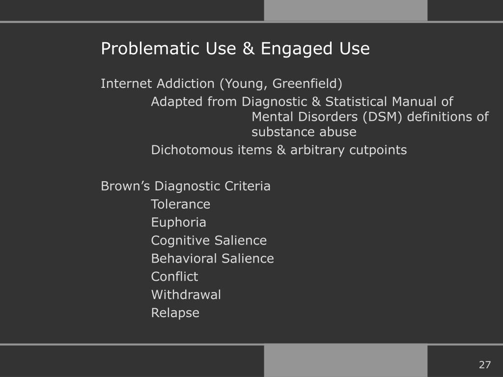 Problematic Use & Engaged Use • Internet Addiction (Young, Greenfield) • Adapted from Diagnostic & Statistical Manual of Mental Disorders (DSM) definitions of substance abuse • Dichotomous items & arbitrary cutpoints • Brown’s Diagnostic Criteria • Tolerance • Euphoria • Cognitive Salience • Behavioral Salience • Conflict • Withdrawal • Relapse