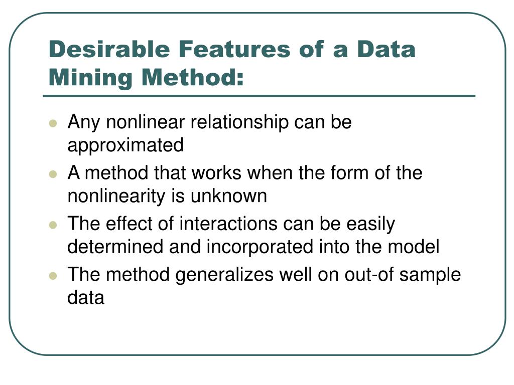 Desirable Features of a Data Mining Method: • Any nonlinear relationship can be approximated • A method that works when the form of the nonlinearity is unknown • The effect of interactions can be easily determined and incorporated into the model • The method generalizes well on out-of sample data