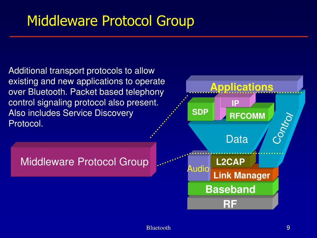 IP Control Data Middleware Protocol Group Additional transport protocols to allow existing and new applications to operate over Bluetooth. Packet based telephony control signaling protocol also present. Also includes Service Discovery Protocol. Applications SDP RFCOMM Middleware Protocol Group Middleware Protocol Group Audio L2CAP Link Manager Baseband RF Bluetooth